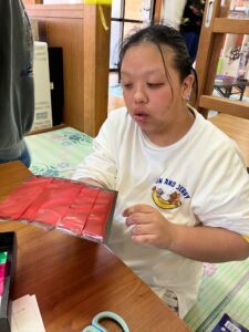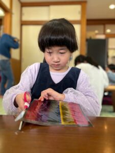 この日は天気が良かったこともあり、完成した作品は玄関先のアーケードへ貼ってみることになりました!