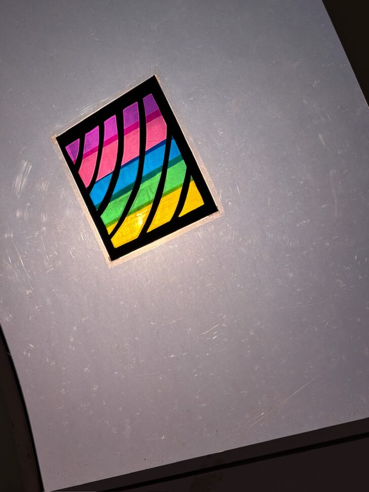 画用紙を虹🌈の形に切り抜き、カラーフィルムを組み合わせると、、、