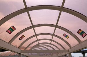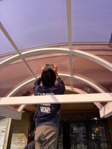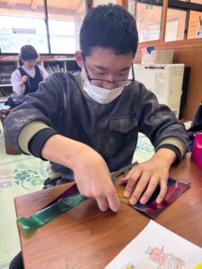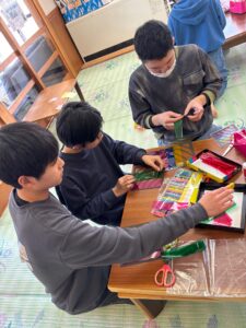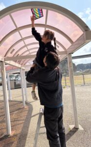この日は天気が良かったこともあり、完成した作品は玄関先のアーケードへ貼ってみることになりました!